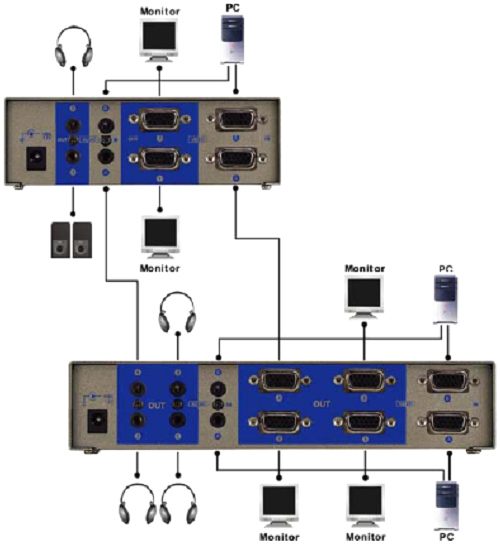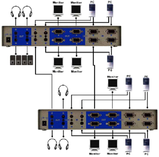 ▲ [注意]:雖然允許多級VGA視頻/音頻矩陣器的串接,但是如果串接級數太多可能會使顯示圖像不穩定。