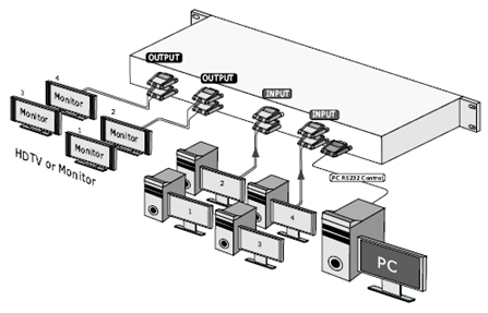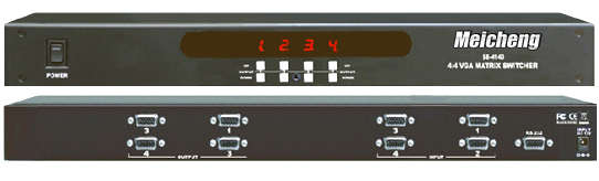 支援4組輸入,4組輸出,電腦高解晰度影像訊號VGA(RGBHV)矩陣切換器,控制方式可由前方面板控制,具RS-232控制埠或紅外線遙控器切換選擇影像訊號。