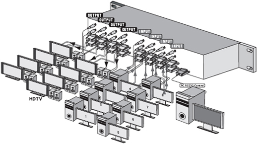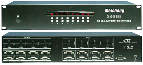 支援8組輸入,8組輸出,電腦高解晰度影像訊號VGA(RGBHV)+立體聲音矩陣切換器,控制方式可由前方面板控制,具RS-232控制埠或紅外線遙控器切換選擇影音訊號。