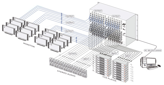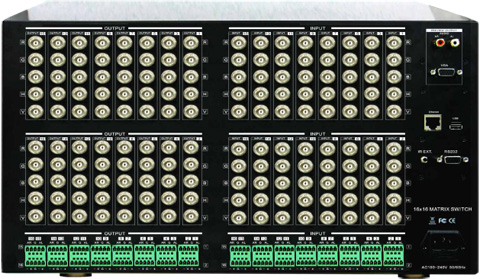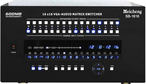 為高速VGA(RGBHV) 16進16出 影音交叉矩陣轉換器影像頻寬為525MHz,最高可到600MHz,支援多款訊號源,VGA、色差、AV及類比音源,為高解析度影音系統提供一種便利的解決方案。
