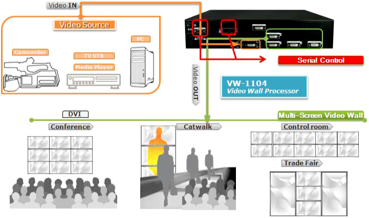 VW-1104電視牆處理器(四畫面),是專為電視或投影機牆設計之設備。VW-1104功能強大,可支援動態即時資料及影像。VW-1104電視牆處理器最多可在四個任意組合排列的屏幕上顯示兩路圖像信號或視頻信號。圖像可以在螢幕上的任意位置(單一或跨屏)、以任意大小(按照精準的長寬比或自訂、拉伸、匹配大小、整體顯示或局部細節顯示)來呈現畫面。與其他同類型產品不同,VW-1104 電視牆處理器完全不限制使用者對於顯示方式之選擇;隨意組合的多屏幕陣列可透過本處理器形成真正的虛擬屏幕,可以在其上以任意方式顯示窗口,千變萬化的程度讓同類型產品難以望其項背。