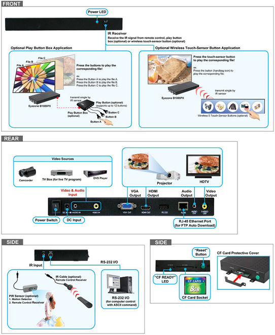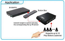 B1080PX 是一款小型的商業廣告機,將多媒體儲存於各式儲存媒體上,再插入播放機即可透過輸出介面於TV、VGA、YPbPr 或 HDMI (1920 x 1080P)等高解析螢幕上,具備16:10 / 16:9 / 4:3顯示模式。多功能的控制方式,只要依需要選購各種專業功能選配,即可達到最佳的互動功能,以符合您各種場合的需要。