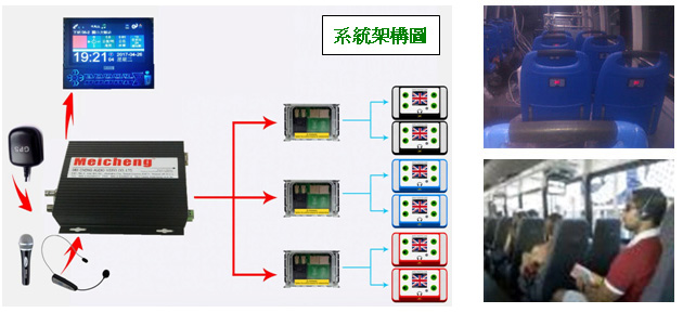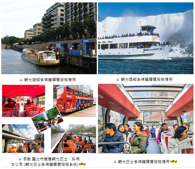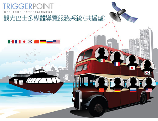 GPS觀光巴士多媒體導覽服務系統 包含:GPS主機-多頻道自動播放主機、主機顯示器、集線器、語言選擇器(座位端)和路線管理軟體等五大部分組成。該系統採用32位元嵌入式平台設計的GPS多語種講解系統,相對傳統的工業PC設計的平台來說,價格更低,性能更加穩定。在GPS播報方面採用與公車語音報站系統相同的核心演算法(T-TRY),該演算法可以依據車輛的行駛狀態,GPS訊號狀態動態調整報站距離,從而提高了報站準確度和靈活性。