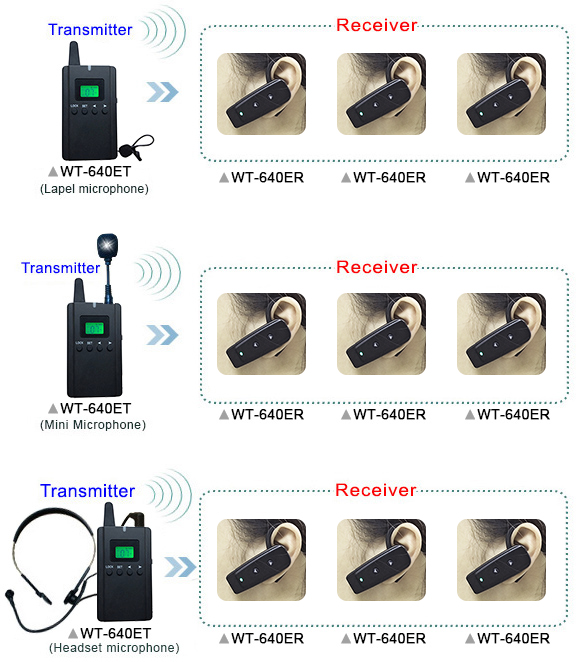 此系列提供即時口譯人員、表演者、音樂家及導覽人員的完善解決方案。此系統包括攜帶型發射器(WT-640ET)、輕巧易攜帶型的掛耳式接收器(WT-640ER)及接收器專屬充電收納箱(HDC54);採多頻道數位式2.4G超高頻傳輸設計、發射器具LCD液晶面板顯示讓解說者更易於辨視與操作、掛耳式接收器猶如手機專用的藍牙耳麥,直覺又人性化的操作,亦有低電量LED閃爍燈示。