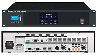前面板具電源開關鍵、中/英文圖形化功能顯示窗【4.3吋LCD觸控液晶顯示幕】及可顯示麥克風系統連線狀態及系統測試、所有的會議管理模式功能與設定、聲音輸入、輸出等音量及會議麥克風體聲控靈敏度調整及會議麥克風工作等操作資訊,皆以數字或文字顯示於功能顯示窗上,並用按鍵式進行數位化操作與設定,也可由功能顯示窗顯示未連線及故障麥克風代碼。主機內建USB/SD卡MP3錄音和重播功能及圖形顯示幕,不錄音時,亦可播放WAV和MP3作為背景樂。 |