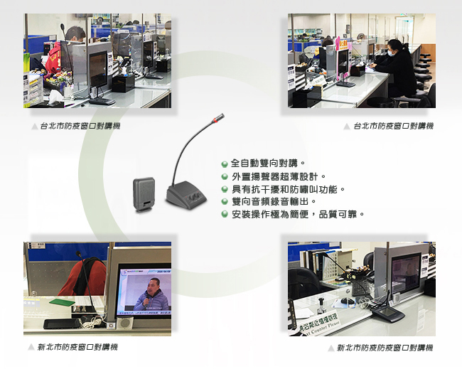 壓克力隔板能有效隔離飛沫,但因為阻隔的關係,變得溝通不如以前順暢,透過雙功能窗口對講機,採用雙向語音對講通訊技術,可以解決因阻隔所造成的溝通不良的問題,交談無阻礙。