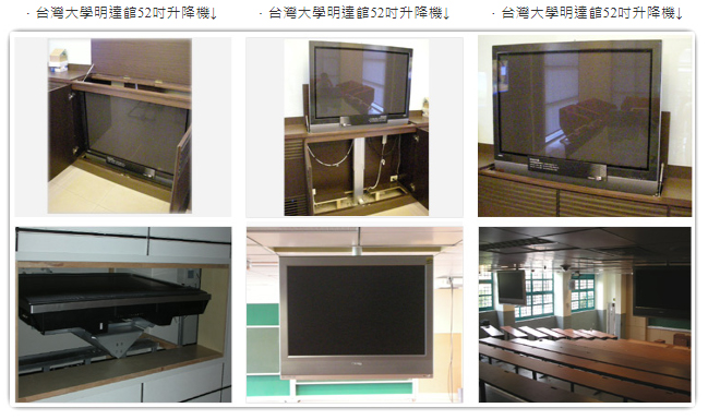 當您要欣賞電視節目時,您只需輕輕一按,電視就由櫃子內升起,當您不看電視時。它就隱藏在您的裝潢裡,美觀、大方.不讓科技產品破壞您典雅的裝潢 特殊安全裝置.施工容易迅速。