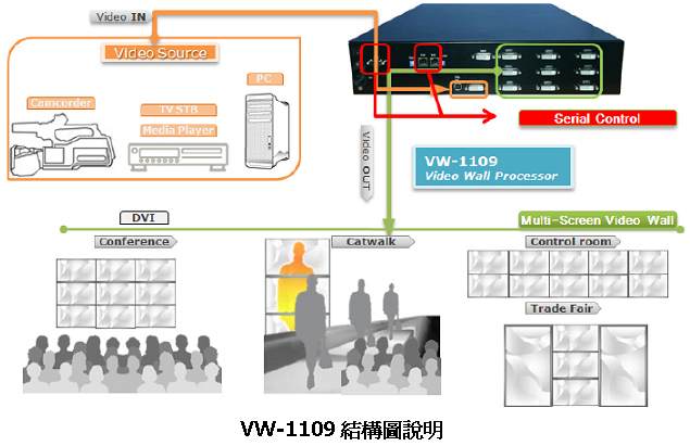 VW-1109 電視牆處理器(九畫面),是專為電視或投影機牆設計之設備。VW-1109 功能強大,可支援動態即時資料及影像。VW-1109 電視牆處理器最多可在九個任意組合排列的屏幕上顯示兩路圖像信號或視頻信號。圖像可以在螢幕上的任意位置(單一或跨屏)、以任意大小(按照精準的長寬比或自訂、拉伸、匹配大小、整體顯示或局部細節顯示)來呈現畫面。與其他同類型產品不同,VW-1109 電視牆處理器完全不限制使用者對於顯示方式之選擇;隨意組合的多屏幕陣列可透過本處理器形成真正的虛擬屏幕,可以在其上以任意方式顯示窗口,千變萬化的程度讓同類型產品難以望其項背。