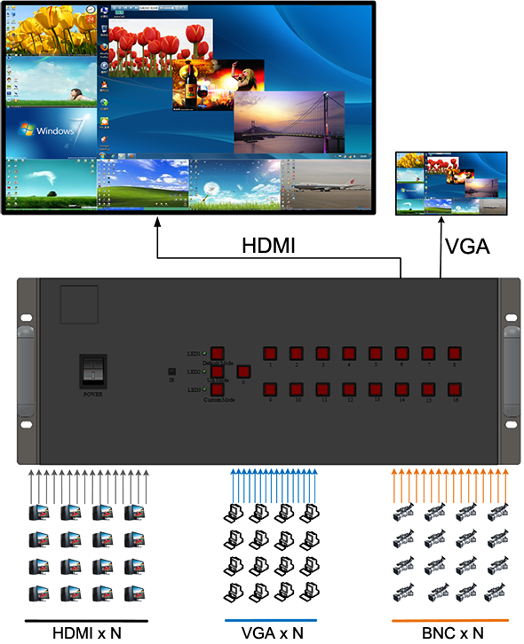 這是一款高性能的高解析多畫面分割器,主要功能是將輸入至高解析多畫面分割器的多路BNC、VGA、HDMI訊號轉換成一路高解析HDMI和VGA訊號輸出,使多個數位訊號同時顯示在一個高畫質顯示單元上。