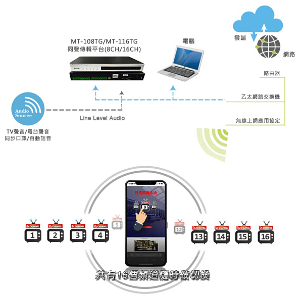 Wi-Fi 流媒體 同聲傳譯系統(隨處收聽):MT-108TG(8CH) & MT-116TG(16CH) 同聲傳譯平台