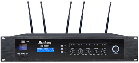 前面板上有大螢幕LCD顯示窗、電源開關鍵、個別單體通道音量調整鈕、頻率調整鍵、設定鍵等。採分級功能選單設計,使操作能更簡單方便。且具有電量顯示、電量不足警示、頻率通道和訊號指示等功能。當控制主機電源關閉後,同時也會關閉所有單體的電源。 |